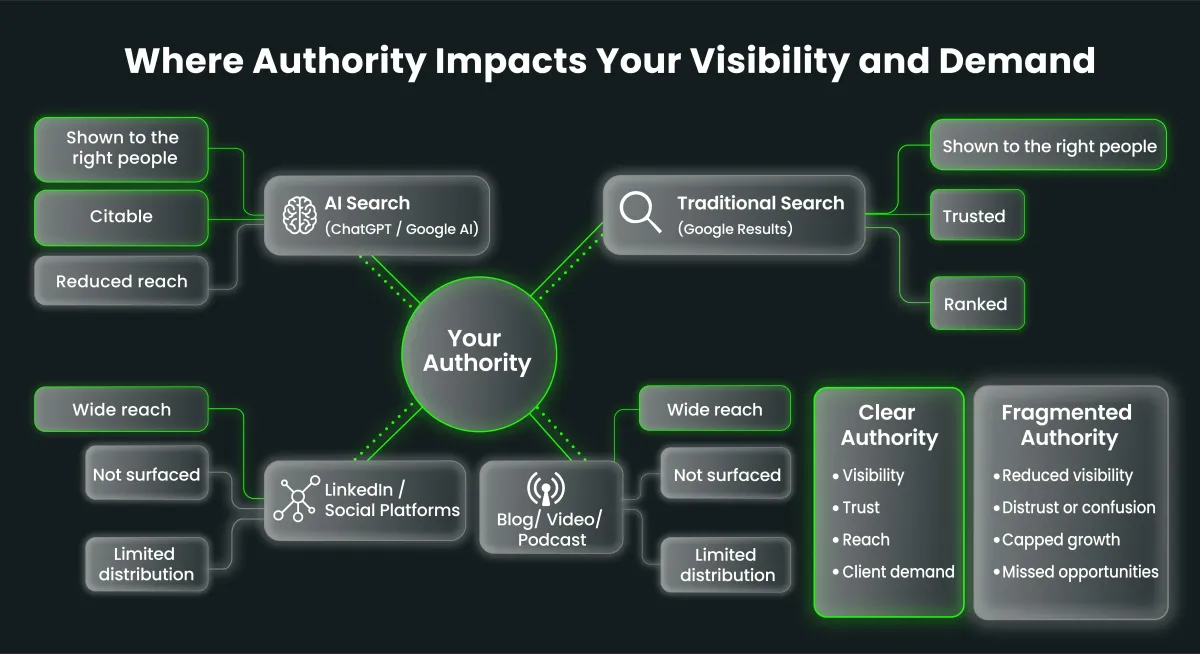Until the score is repaired, it is unlikely that your ICP will see the content you create. You will not be surfaced in traditional search. You will not appear in AI-generated answers. Every piece of content you publish gets scored against a fragmented identity and suppressed accordingly. You are not just invisible. You are actively working against yourself every time you post.
